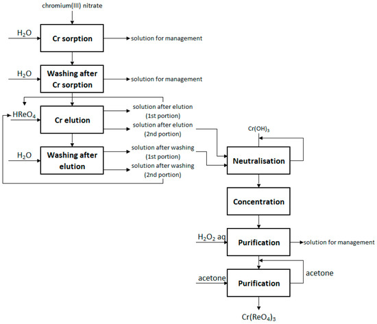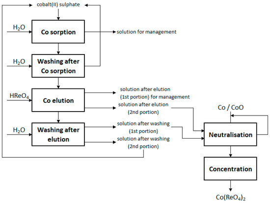 Perrhenic acid (IMN, Gliwice, Poland), containing 900.0 g/dm3 Re, <20 ppm NH4+, 10 ppm Cr, <10 ppm K, 10 ppm Ni, 8 ppm Co, <5 ppm Mo, <5 ppm Pb, 4 ppm Al, <3 ppm Ca, <3 ppm Cu, <3 ppm Fe, <3 ppm Mg, <3 ppm Zn, <2 ppm As, <2 ppm Bi was used as a rhenium source [10,11,12]. Nickel(II), cobalt(II), chromium(III) nitrates and/or sulphates (Alfa Aesar Chemat, Gdańsk, Poland) were used as sources of other metals. Mineral acids, like sulphuric or nitric acid (Avantor, Gliwice, Poland) were applied for ionite regeneration. Solution of 30% hydrogen peroxide and acetone (Sigma Aldrich, Poznań, Gliwice, Poland) were used for purification. Nickel(II) and cobalt(II) oxides, metallic nickel and cobalt (Merck, Warsaw, Poland) as well as prepared chromium(III) hydroxide (IMN, Gliwice, Poland) were applied for neutralization. Distilled water (<2 μS/cm) was used in the experiments.