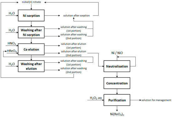 Preparation of anhydrous nickel(II) perrhenate, the basics of which were described in the previous publications [15,16,17], was performed using clear aqueous nitrate solutions, containing 5 g/dm3 Ni. Appropriate amounts of the solutions required to achieve over 6% degree of ionite saturation and 0.1 g/dm3 chromium in the solution after sorption were used. The solutions were passed through a bed of C160 ionite in hydrogen form. The bed was placed inside a column which parameters were described in Section 2.3. Tests were carried out according to the similar methodology as for abovementioned perrhenates. Solution after sorption was recycled to the step of sorption solution preparation. After sorption ionite was washed with water in two steps, proceeding down the column, at a flow rate between 2.5–5.0 dm3/h. Combined solutions were recycled to step of sorption solution preparation. Washed column with nickel-sorbed bed was subjected to elution. It was carried out using aqueous solutions of perrhenic acid or solution obtained combining perrhenic acid with the first portion of the washings after elution. Total rhenium concentration in these solutions was over 500 g/dm3 rhenium. Concentrated nitric acid in an amount of 20 cm3 per each 1 dm3 of eluent was added. For each 1 g of sorbed nickel, 20 g of rhenium were used. Solution generated after elution was also collected in two portions. The first one (up to 0.5 bed volume) was directed for management using known methods, while the second proper portion (up to 2 bed volumes) was neutralized. Eluted ionite bed was washed with water, whereas solution from washing after elution was collected in two portions—the first one was recycled to eluent preparation, while the second portion was directed to preparation of sorption solution. Solution for neutralization generated in cycles I-II were combined and subsequently neutralized with metallic nickel, solutions from cycles III-IV were joined and neutralized with nickel(II) oxide, whereas solutions from cycles V-VI were also combined and neutralized with metallic cobalt. All neutralizing agents were used in stoichiometric amounts with respect to rhenium, which was present in excess. Irrespective of the applied agent, neutralization was carried out below 80 °C, until solution pH reached 7–8. Solution after neutralization was hot filtered from solid impurities. Concentration of solution after neutralization was also performed at temperature <80 °C with vigorous mixing until dryness. Then, it was purified with 30% aqueous hydrogen peroxide solution using 2 cm3 of the solution per each 1 g of the solid. Solids remaining after purification were dried at 160 °C, until constant mass and, then, stored in a glass vessel under argon [18]. The scheme of the applied Ni(ReO4)3 preparation method is presented in Figure 3.