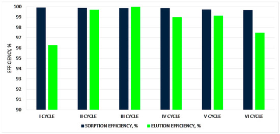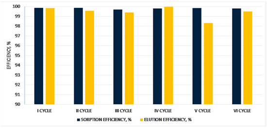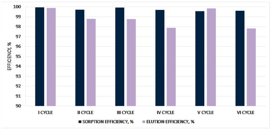 Six cycles of chromium(III) perrhenate preparation under dynamic conditions were performed. Balance sheets of conducted trials are shown in Table 1, Table 2, Table 3, Table 4, Table 5 and Table 6. Changes of sorption and elution efficiency in subsequent cycles of ionite work are presented in Figure 4.