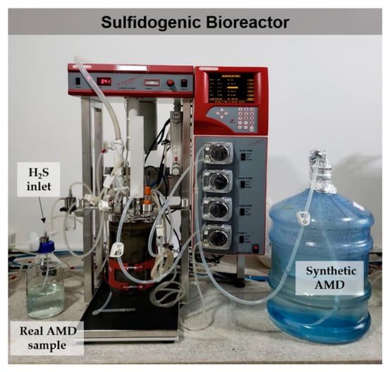 An up-flow sulfidogenic stirred tank reactor (Fermac 2000, Electrolab Biotech, Tewkesbury, UK), with a working volume of 2.3 L, was inoculated with an acidophilic SRB consortium, obtained from an anaerobic sediment found in an acidic river located in northern Chile, and operated under continuous flow, according to Ñancucheo and Johnson []. The bacterial consortium was immobilized on a 1–2 mm diameter porous glass beads, occupying 40% of the vessel’s volume, and the anoxic condition was maintained through 150 mL/min N2/CO2(g) (70/30%) injection. The pH (4.5), temperature (30 °C), and agitation (40 rpm) were constantly monitored using an automatic control unit coupled to the bioreactor (Tec-Bio-Flex, Tecnal, Piracicaba, Brazil).