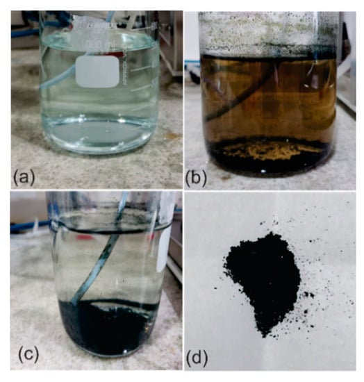 Transitional copper stages during Acid Mine Drainage (AMD) sample exposure to biogenic H2S. (a) AMD sample predominating the soluble copper form before biogenic H2S exposure. (b) Initial soluble copper reduction to polysulfides by biogenic H2S. (c) Secondary polysulfides reduction to covellite by biogenic H2S. (d) Vacuum filtered and recovered dried covellite from AMD.