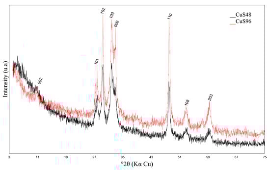 In both samples, all observed diffractogram peaks, corresponded to the typical covellite planes (CuS)—(101), (102), (103) (006), (110), (108), and (203)—in agreement with the International Centre for Diffraction Data (ICDD) database [01-075-2233] and [03-075-2233], with the exception of plane (002) that was only observed in the CuS96 sample, but also matched the covellite profile (Figure 3). CuS96 sample´ diffractogram exhibited sharper and more intense peaks compared to CuS48, indicating that the AMD time of exposure to biogenic H2S positively influenced covellite crystals ordination. This was corroborated with the intensities of (110) and (002) diffraction planes, which indicate the presence of preferential orientation and crystal growth orientation along the c-axis [].