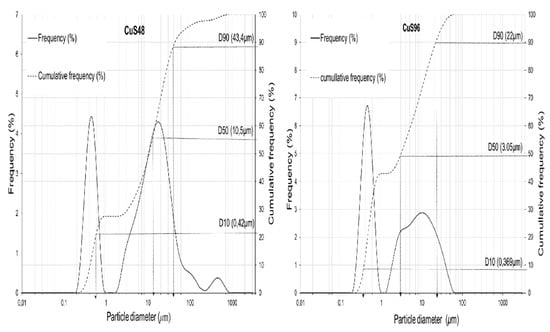 Table 4 shows the particles diameter distribution (Dv(10), Dv(50), and Dv(90)) of the samples. Dv index characterizes the particle size distributions, which are calculated through intercepts to 10, 50, and 90% of the cumulative volume []. In general, the higher exposure time of AMD to biogenic H2S (CuS96) resulted in smaller covellite particles as observed by Dv(90) and Dv(50) distribution parameter (Figure 4). In sample CuS96, 90% of the particles had a size of 22 µm or less, whereas 90% of the particles in sample CuS48 had a size of 43.4 µm or sless. The smallest obtained covellite particle sizes were below 0.37 and 0.42 µm in samples CuS96 and CuS48, respectively, representing 10% of the samples size distribution (Dv(10)).