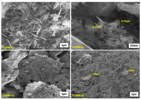 Scanning electrons microscopy (SEM) images of CuS48 and CuS96 samples with aggregate grains, placoid sheets, and hexagonal habit.