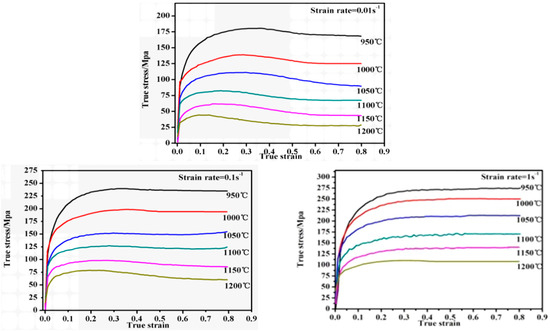 Further, it can be seen that the flow stresses of curves are sensitive to the deformation temperature and strain rate. Flow stress decreased with the increasing temperature and the decreasing strain rate. This is because at a certain strain rate, higher deformation temperatures resulted in greater dislocation activity, which could promote the nucleation and growth of DRX and reduce the value of flow stress. Moreover, when the deformation temperature was constant, there was enough time to complete the softening effect caused by DRX at lower strain rates, thus leading to the decrease in flow stress.