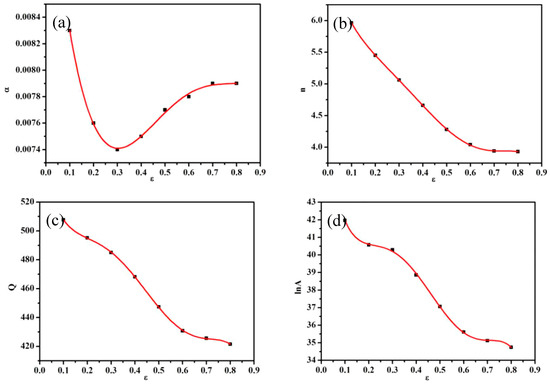 The relationship between equation parameters and true strain: (a) , (b) n, (c) Q, (d) lnA.