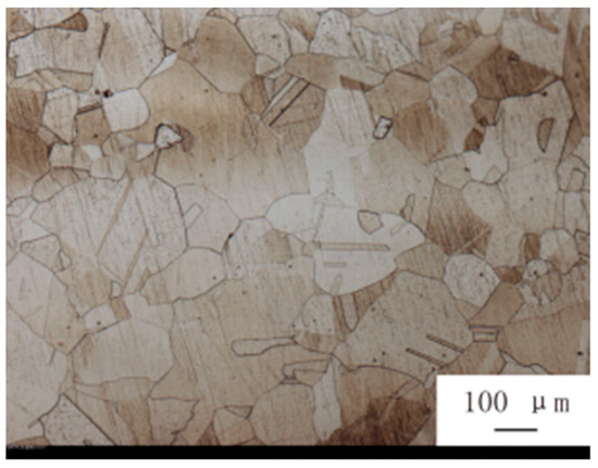 The original metallographic picture of Nb-contained 316LN used in this paper is shown in Figure 7. The average grain size was measured as 180 μm. Annealing twins with straight grain boundaries existed in the microstructure. For Nb-contained 316LN is a kind of Face Center Cubic structure stainless steel with low SFE, the occurrence of twins is frequent.