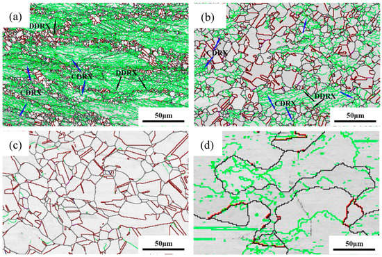 Figure 9b represents the microstructure of group 2 that was compressed at 1100 °C and 0.1 s−1. The obtained EBSD data express that the recrystallized fraction is 72%, average size of recrystallized grains is 22.5 μm. Although the microstructure became uniform comparing to group 1, some unrecrystallized areas with low angle boundaries still existed. Arrows signed in Figure 9b show the evidence of bulging nuclei and subgrain evolution, indicating that CDRX and DDRX are two main DRX mechanisms of specimens compressed at conditions of group 2.