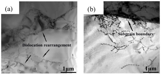 TEM micrographs of the Nb-contained 316LN compressed at 1100 °C, 0.1 s−1 (a) dislocation rearrangement (b) subgrain boundary transformation.
