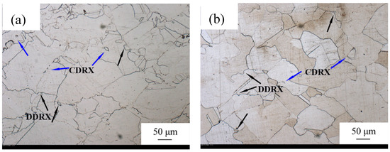 Although microstructure characteristic of group 3 and group 4 were observed, the DRX mechanism of these two groups cannot be seen intuitively. So microstructures of specimens compressed under a smaller strain at the same temperature and strain rate as those of group 3 and group 4 were observed as shown in Figure 11. From Figure 11a, it can be seen that at temperature 1200 °C, strain rate 1 s−1, and strain 0.2, DRX just initiated. Serrated grain boundary and newly formed recrystallized grain along the original boundaries indicate the occurrence of DDRX (shown by black arrows). In addition, some newly formed recrystallized grain (marked by blue arrows) existed in the interior of original grain, indicating that CDRX is another DRX mechanism in the sample. Figure 11b is the microstructure of specimen compressed under strain 0.2 at 1200 °C and 0.01 s−1. It is discernible that the original grain was completely replaced by grown up recrystallized grains, thus demonstrating that DRX occurred adequately at a small strain when temperature is 1200 °C and strain rate is 0.01 s−1. This happened because the high temperature of 1200 °C accelerated the activity of dislocation and the low strain rate of 0.01 s−1 afforded enough time for dislocation movement. It is also obvious that DDRX and CDRX are two main DRX mechanisms at conditions of group 4.