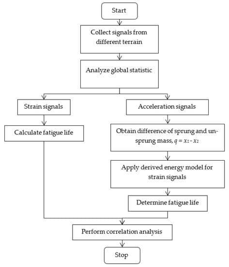 Although there were limitations in the low amplitude strain signals, the elastic-energy model still provided a close prediction for most of the fatigue life predictions. With the discovery of past and current research, the fatigue strain data could be developed via this proposed elastic-energy model. The analysis of strain data in the automotive industry is challenging and significant because each of the data is long and valuable [48,49]. Hence, the development of a durability model has been aggressively performed, such as regression models for fatigue life prediction [50]. More recently, strain data was also generated through a multi-body dynamics model for automotive suspension fatigue analysis [16]. However, the generation of strain signal through simulation could be deficient due to a large quantity of suspension kinematic data and linkage properties. In addition, the proposed elastic-energy model considers the torsional and surface tension of coil spring when performing strain generation. This research may significantly reduce the required testing equipment, such as strain gauges and data logger for automotive suspension component fatigue life prediction.