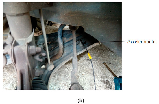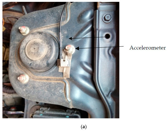 In this analysis, the main task was to utilize the developed coil spring displacement to strain relationship to predict the fatigue life of a coil spring. The initial task is to perform conversion of acceleration-to-displacement, where the data collection from a vehicle was vital. The conversion of acceleration signal involved an experimental setup of a selected passenger vehicle in different road conditions. A single axis strain gauge and two accelerometers were used in this experimental data collection. A frontal coil spring of a 1300 cc sedan passenger car were selected as a case study vehicle, due to the common usage of this local manufacturer automobile. The details of acceleration to strain conversion process flow are shown in Figure 2. One of the accelerometers were attached on the top mount while another one was attached to the lower arm of the vehicle front suspension strut using strong adhesive glue. Meanwhile, the accelerometer attachments were examined to ensure the stability of measurement. The accelerometer setup for top mount and lower arm are shown in Figure 3a,b, respectively. On the other hand, a strain gauge was attached to the coil spring using adhesive glue for strain signal measurement as shown in Figure 4. The strain gauge was attached on the coil spring critical spot as proposed in [16]. Both strain gauge and accelerometers were connected to the data logger as shown in Figure 5 and the data loggers were then connected to a laptop for real time monitoring purposes. According to related literature [29], the sampling frequency for this application should be greater than 400 Hz to include all road-induced responses. Hence, the sampling frequency of 500 Hz was determined for this road measurement [30]. After setting up the measurement, the vehicle was driven over three different areas (urban, rural, and campus) for various road responses on spring data collection.
