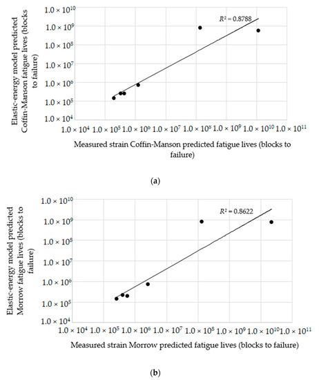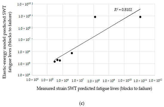 To quantify the correlation between the elastic-energy model and measured strain predicted fatigue lives, power law correlation was applied to evaluate the fatigue life data for three strain life approaches, as shown in Figure 19. In Figure 19a, the elastic energy and measured strain predicted fatigue life using Coffin-Manson method has shown a coefficient of determination (R2) value of 0.8788. On the other hand, the R2 value using Morrow model was 0.8622 and SWT model showed an R2 value of 0.8102. According to Sivak and Ostegova [47], when a R2 value for fatigue analysis was above 0.80, the correlation was considered as good. Hence, it suggested that the elastic-energy model was suitable for fatigue life predictions. Additionally, the Coffin-Manson approach has shown the highest R2 value which proposed that the mean stress models were less effective in the application of converted strain signals.
