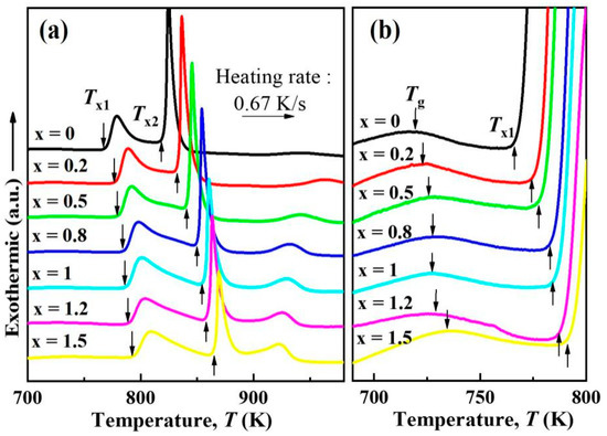 The thermal properties of as-cast ribbons were estimated by DSC at a heating rate of 0.67 K/s, as shown in Figure 2. The pattern of Nb-free alloy exhibits a distinct temperature range between the first and second exothermic peaks and a large area followed by the first crystallization peak, which means that a massive number of α-Fe(Si) crystals were precipitated. This indicates that the (Fe0.76Si0.09B0.1P0.05)99.3Cu0.7 alloy is an excellent candidate for nanocrystallization. However, the low initial crystallization temperature (Tx1 = 679 K) and relatively small supercooled liquid region implies low thermal stability against crystallization and thus low GFA. However, the Tx1 increased by 27 K when the Nb content was up to 1.5 at. %, indicating the significant enhancement of stability. All the samples exhibited observable ΔTx and followed a trend (initially increasing with the amount of Nb, followed by decreasing), as shown in Figure 2b, with the maximum value of 67 K when the amount of Nb reached 1 at. %. The large ΔTx favored the high GFA in the Nb-containing alloys. Furthermore, the patterns of all the Nb-containing alloys exhibit obvious intervals between the first two exothermic peak temperatures Tx2 and Tx1, which is defined as ΔT (ΔT = Tx2 − Tx1). The ΔT expanded gradually to about 70 K with the addition of 1.5 at. % Nb.