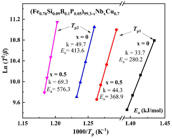 where β, R, Ea, ν, and Tp are the heating rate, gas constant, action energy, frequency factor, and peak temperature of crystallization, respectively. As seen in Figure 3, Ea1 and Ea2 were calculated as 280.2 and 413.6 kJ/mol, respectively, for the (Fe0.76Si0.09B0.1P0.05)99.3Cu0.7 alloy, and 368.9 and 576.3 kJ/mol, respectively, for the (Fe0.76Si0.09B0.1P0.05)98.8Nb0.5Cu0.7 alloy. The activation energy of the Nb-containing (0.5 at. %) alloy is much higher than that of its counterpart Nb-free sample. Therefore, it is more stable to maintain the amorphous structure of the Nb-containing alloy. Moreover, the ΔEa (ΔEa = Ea2 − Ea1) of the Nb-containing alloy (207.4 kJ/mol) is higher than the Nb-free alloy (133.4 kJ/mol) and this is more conducive to maintaining the α-Fe(Si) single-phase structure of the alloy. These improvements are mainly due to the existence of Nb [22]. The weak diffusion ability of Nb atoms and enrichment in the interface between α-Fe(Si) and the amorphous phases greatly suppress the growth of grains. Furthermore, Nb has a strong affinity with B and P, making the Ea much higher [18,21,22].