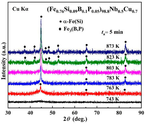The energy crisis is the most serious problem in the development of the current world. Therefore, to improve efficiency and reduce power consumption, higher saturation magnetization (Bs) accompanied with excellent soft magnetic properties (SMPs) is strongly required for the magnetic materials used in electrical power supplies and a variety of other industries. Since the Fe73.5Si13.5B9Nb3Cu1 (FINEMET) nanocrystalline alloy obtained through crystalization of the corresponding glassy precursors was first reported by Yoshizawa in 1988 [1], Fe-based nanocrystalline alloys have attracted great interest because of their excellent SMPs and extremely low core loss, and thus their low energy consumption and high efficiency [2,3]. Then, a wide variety of new alloys with improved SMPs for electronic and electric industries have been developed through composition adjustment and microstructure evolution, mainly focusing on the FeSiBNbCu, FeSiBCu, and FeSiBPCu alloy systems [1,2,3,4,5,6,7]. Much work has been devoted to studying the mechanism of the nanocrystalline microstructural evolution in these alloys. Hono et al. reported that Cu atoms formed clusters prior to the onset of the crystallization reaction in nanocrystalline FeZrBCu and FeSiBNbCu alloys [8]. By employing a three-dimensional atom probe and a high resolution electron microscope, it was further evidenced that Cu clusters were indirectly making contact with the α-Fe(Si) nanocrystals, suggesting that the α-Fe(Si) particles heterogeneously nucleated at the site of Cu clusters [9]. As Nb was enriched in the remaining amorphous phase, the interface between α-Fe(Si) and the amorphous phase could be clearly seen from the drastic change in the concentrations of Nb, which suppressed the growth of α-Fe(Si) grains.