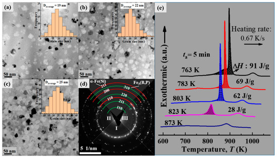 The changes in the structure of the Nb-containing amorphous alloy with annealing crystallization were examined by XRD, as shown in Figure 4. The alloy remained in the amorphous state until annealed at 743 K for 5 min. As Ta rose to 763 K, there was only the α-Fe(Si) phase and no other crystallization phases for the alloy could be observed until Ta increased to 803 K. When Ta was elevated to 823 K, the other diffraction peaks emerged, which was in accordance with that of the Fe3(B,P) phase [18]. The structures of the Nb-containing amorphous alloy after annealing at 783, 803, and 823 K for 5 min were further examined by TEM. After annealing at 783 K for 5 min, as shown in Figure 5a, the crystallization phase is identified as α-Fe(Si) from the the selected area electron diffraction (SAED) patterns in Figure 5d. The α-Fe(Si) grains had an average size of approximately 19 nm, randomly dispersing in the residual amorphous matrix. It can be seen from the TEM image of Figure 5b that the volume fraction of the crystallization phase obviously increased and the residual amorphous matrix relatively decreased when annealed at 803 K, owing to the continuous precipitation and growth of grains. The average size increased to 22 nm and there were not just α-Fe(Si) grains, but a few Fe3(B,P) grains in the crystallization products, which can be identified from Figure 5d, but failed to be observed by XRD, as shown in Figure 4, as a result of its limited resolution. As Ta increased to 823 K (Figure 5c), the amorphous matrix had almost disappeared, and the α-Fe(Si) and Fe3(B,P) grains dispersed randomly with an average size of approximately 25 nm. Meanwhile, the heat enthalpy (ΔH) for the two discussed phases decreased continually, meaning the decreasing of the residual amorphous phase, as shown in Figure 5e. The disappearance of the first exothermic peak with Ta indicates that the crystallization of α-Fe(Si) had finished completely, then the second phase began to dominate the crystallization process. In summary, the crystallization evolution of (Fe0.76Si0.09B0.1P0.05)98.8Nb0.5Cu0.7 ribbon can be summarized as follows: