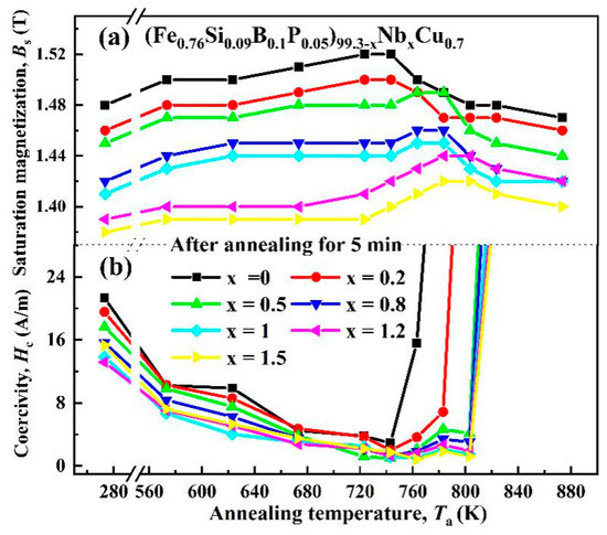 (a) Bs and (b) Hc of (Fe0.76Si0.09B0.1P0.05)99.3−xNbxCu0.7 (x = 0–1.5) ribbons dependences on Ta annealed for 5 min.