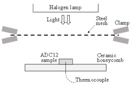 Figure 1 shows a schematic illustration of the heat treatment of an Al sample by optical heating. An ADC12 (Al–Si–Cu die-casting alloy, solidus and liquidus temperatures of 515 °C and 580 °C [], respectively, thermal conductivity of 92 W/m·°C) sample without a blowing agent having dimensions of 15 mm × 15 mm × 6 mm was used. The ADC12 sample was placed on a ceramic honeycomb with a thermocouple placed 3 mm from the bottom center of the sample to measure the temperature at the center of the sample. A halogen lamp was used for the optical heating. The current and voltage of the halogen lamp during the heat treatment were 7.0 A and 48 V, respectively. The distance between the lamp and the upper surface of the ADC12 sample was 50 mm.