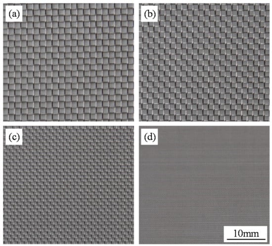 Steel meshes used in this study: (a) φ = 66.9%. (b) φ = 57.6%. (c) φ = 49.8%. (d) φ = 38.3%.