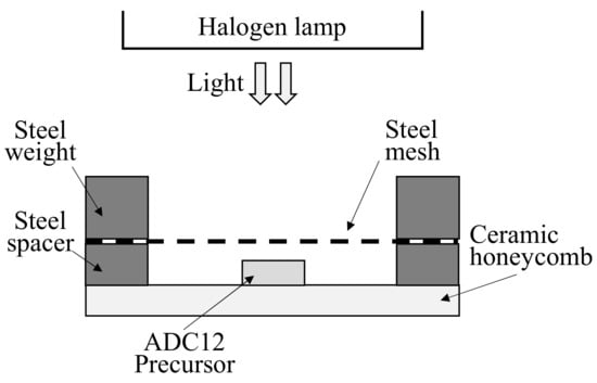 Figure 3 shows a schematic illustration of the foaming of the ADC12 precursor by light through the steel mesh and the restriction of the upward expansion by the steel mesh. The ADC12 precursors were fabricated by the friction stir welding (FSW) route in accordance with Ref. [,,]. ADC12 die-casting plates [] were used as the starting material. Titanium(II) hydride (TiH2, <45 μm, 1 wt %) and α-alumina (Al2O3, ~1 μm, 5 wt %) were used as the blowing agent and stabilization agent, respectively. Precursors with dimensions of 15 mm × 15 mm × 6 mm were obtained.