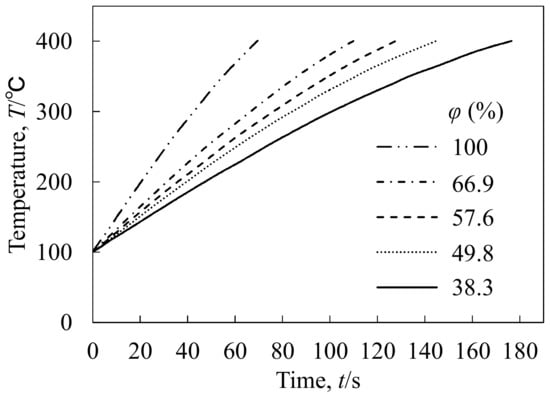 Figure 4 shows the relationship between the temperature of the ADC12 sample T and the heating time t for each φ. t = 0 s was defined as the time when the temperature reached 100 °C. It was found that the temperature reached 400 °C first when no mesh was used (φ = 100%), and the time required to reach 400 °C increased with decreasing φ. Figure 5 shows the relationship between the rate of temperature increase dT/dt and φ, where dT/dt was evaluated as the slope between temperatures of 200 and 300 °C in Figure 4. It was found that dT/dt vs. φ had a strong correlation with a correlation coefficient of 0.994. These results indicate that the amount of light passing through the mesh used for the heat treatment of the sample was significantly affected by φ.