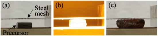 Figure 6 shows the foaming behavior of the ADC12 precursor when using a steel mesh with φ = 66.9%. Figure 6a shows the precursor immediately before the light was turned on and the heat treatment began. Figure 6b shows the precursor during the foaming approximately when it first came in contact with the steel mesh. Figure 6c shows the ADC12 foam shortly after the light was turned off and the foaming stopped. The precursor was successfully foamed by the light passing through the steel mesh and the upward expansion of the ADC12 foam during foaming was restricted by the steel mesh, consistent with our previous study [].