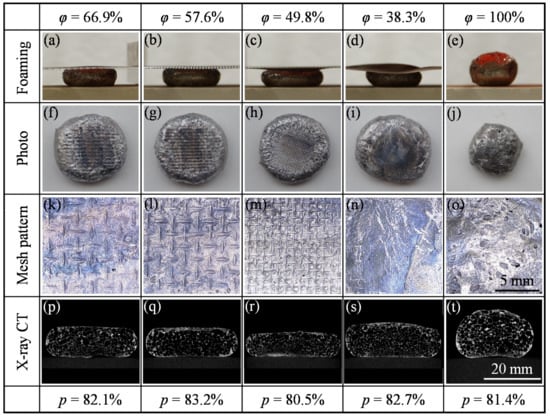 Figure 7p–t shows cross-sectional X-ray CT images of the obtained ADC12 foams. Black and white regions indicate pores and Al, respectively. The upper and lower surfaces were in contact with the steel mesh and the ceramic honeycomb during the foaming process, respectively. It was found that there is no significant effect on the pore structures of the obtained ADC12 foams upon restricting upward expansion during foaming, regardless of the value of φ. Porosities of around 80% were observed for every sample, similar to that obtained by free foaming and by the precursor foaming process in Ref. [,]. The thickness of the ADC12 foams was similar to that of the steel spacers for φ = 66.9% and 57.6% but different for φ = 49.8% and 38.3% owing to the deflection of the steel mesh. The effect of thermal strain on the accuracy of the shape of the obtained Al foam is an important issue even in the case of using a general rigid mold for shaping Al foam. Deflection of the steel mesh during the foaming process may be prevented by preheating the entire steel mesh. This issue should be investigated in a future study.