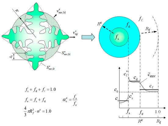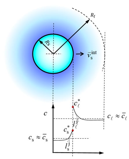 With the known , namely , other solidification/remelting induced exchange terms , , can be calculated. The diffusion lengths are estimated as = , = , assuming a steady state diffusion field during spherical crystal growth (Figure 3). If a parabolic diffusion profile inside the solid is assumed, (= ) can be estimated as [40]; and if the inter-grain impingement of the diffusion field is considered, (= ) should be calculated as [70,71]. This diffusion length must be modified if the effect of turbulent flow is to be considered [41]. Referring to Table 2, the average interfacial velocity takes the liquid velocity for the case of solidification, the solid velocity for the case of remelting; the average interfacial enthalpy takes the liquid enthalpy for the case of solidification, the solid enthalpy for the case of remelting ( − = , the latent heat); the average interfacial concentration takes the thermodynamic equilibrium concentration of the solid phase for the case of solidification, the volume-averaged solid concentration for the case of remelting. For most metal alloys, the second term of right-hand-side in Equation (3a), which is used to consider back diffusion in solid, is negligible. One known exceptional case is that the carbon back diffusion in steel is important.