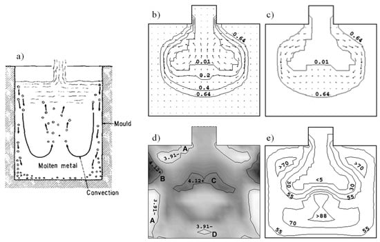 Using a two-phase globular equiaxed solidification model to study the crystal sedimentation phenomenon [55,56]. Numerical simulation was performed in a 2D (0.18 × 0.16 m2) domain for an Al-4.0wt.%Cu alloy. (a) Schematic of the crystal sedimentation phenomenon [101]. Simulation results (80 s) for (b) the velocity of liquid ( = 2.37 mm/s) and isolines of fraction solid, (c) the velocity of equiaxed grains ( = 2.38 mm/s) and isolines of fraction solid, (d) the mixture concentration (dark for positive segregation, light for negative segregation) and its isolines, (e) isolines of grain size in μm. Nucleation parameters: = 1014 m−3, = 10 K, = 4 K.