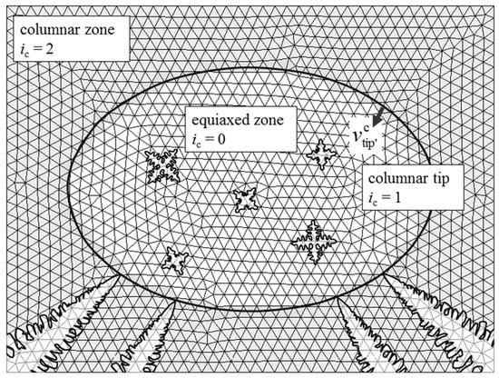 - Each control volume is marked with a status marker, . When , it indicates that the control volume contains the columnar tip front; when , it means that the volume element has been passed by the columnar tip front; otherwise when , it is still in the bulk region where no columnar tip has yet reached it. All elements are initialized with , except for the boundary (wall) elements, which are marked as initial condition with .