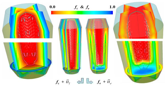 - Both columnar and equiaxed phases can coexist in the same volume element. When fc (local volume fraction of the columnar phase) is more than a critical value, (e.g., 0.2), an infinite drag force coefficient is applied between the two solid phases in the corresponding momentum equations, and thus the equiaxed grains are “captured” by the columnar phase. When fc < , no drag force is applied, and thus, the motion of the equiaxed grains is not affected by the columnar dendrite tips. The validation of the critical value = 0.2 is discussed elsewhere [65].