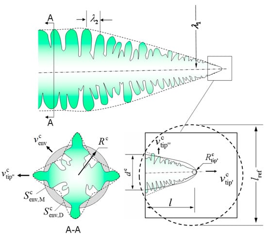 - The growth velocity of the primary dendrite columnar tip, , and the tip radius, , are determined by the LGK (Lipton-Glicksman-Kurz) model [72]. Note that in the late works of the authors, the KGT model [88] was used to track the columnar tip front [84,85]. The average length of the columnar grains in the volume element as marked as columnar tip () is calculated by the integral , starting from the moment when the front enters the control volume element.