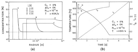 As shown in Table 2, the solidification rate ( ) is the key parameter for determining other solidification-induced exchange terms . The solid-liquid interface area concentration is , where is a surface impingement factor. can be simply modeled as , or treated as an function of [70,71]. Rs is the radius of the equiaxed grain, as calculated by . As shown in Figure 3, the average growth velocity (the same as the local growth velocity ) can be treated as a Stefan problem according to energy, species balance, and thermodynamics at the solid-liquid interface [40,41].