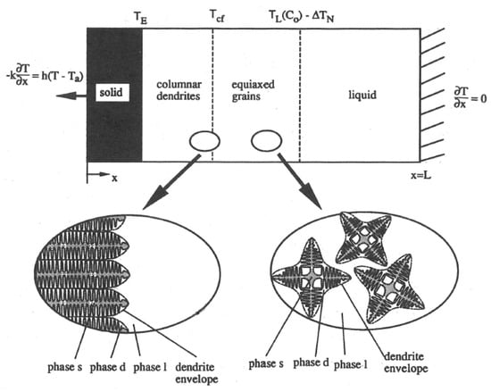 - Ideal morphologies for both solid phases are assumed: spheres for equiaxed (globular) grains, and cylinders for columnar (cellular) dendrite trunks. The radial growth is controlled by diffusion according to the analytically solved concentration profiles around the corresponding crystal. A simplified approach is suggested to treat some hydrodynamic behaviors of equiaxed dendrites [113].