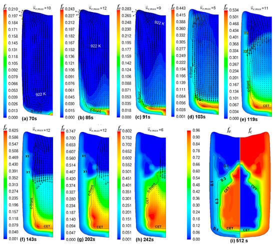 - The columnar tip blocking mechanism of Hunt [112] is implemented for the CET. In those volume elements, that contain the columnar primary dendrite tips, the tip growth velocity, , is set to zero as soon as the local volume fraction of the equiaxed grains, fe, exceeds the critical threshold of . A recent study suggested a value of 0.2 should be taken for [115,116]. The impingement of the solute concentration fields between equiaxed and columnar growths, also known as the ‘soft blocking mechanism’ for CET as proposed by Martorano et al. [117], is automatically included in the model.