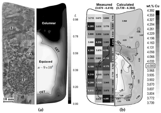 - Wu, M.; Ludwig, A.; Sahm, P.; Bührig-Polaczek, A. Grain evolution and macrosegregation in Al-4.0% Cu casting: Simulation and experimental evaluation. In Proceedings of the 10th Modeling of Casting, Welding and Advanced Solidification Processes (McWASP-X), Destin, FL, USA, 25–30 May 2003; p. 261. [Google Scholar]