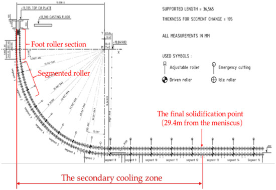 A half three-dimensional solidification finite element model was established due to the symmetry of the slab, and had dimensions of 1200 mm × 2000 mm × 250 mm. DC3D8 is an eight-node linear heat transfer hexahedral element in the ABAQUS software (6.14, Dassault Systèmes Simulia Corp., Providence, RI, USA) and was used to mesh the solidification model to perform thermal simulation analysis. The size of the element was 25 mm (length) × 25 mm (width) × 10 mm (height), and 46,080 heat transfer elements and 51,597 nodes were included in the model. The bulge deformation at the end of the foot roller section was investigated because the bulge deformation of the slab is serious when the slab leaves the foot roller section. Therefore, segmented rollers have been widely adopted to control this deformation. Then, the temperature field at the end of the foot roller section was studied for the analysis. The location of the segmented rollers and the final solidification point are listed in Figure 1.