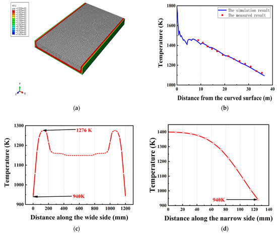 (a) Temperature field of the model. (b) The comparison of the measured and simulated temperature in the center of the narrow face. (c) Temperature on the wide side. (d) Temperature on the narrow side.