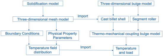 The three-dimensional thermoelastic–plastic and creep coupling models were proposed to investigate slab bulge deformation after temperature distribution and the thickness of the solidified shell had been acquired. The relationship between the solidification heat transfer model and the slab bulge deformation model is illustrated in Figure 4. Q235 steel served as the analytical material of the casting slab. The casting roller material was 40CrMo.