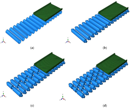 (a) Bulging model with rigid solid rollers. (b) Bulging model with elastic solid rollers. (c) Bulging model with two-segment rollers. (d) Bulging model with three-segment rollers.