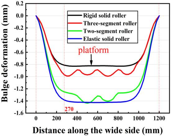 The simulation results of slab bulge deformation along the wide side are shown in Figure 7. The influence of the segmented rollers was numerically analyzed by a comparison between the average values of the bulge deformation. As can be seen in Figure 7, the following conclusions can be drawn: