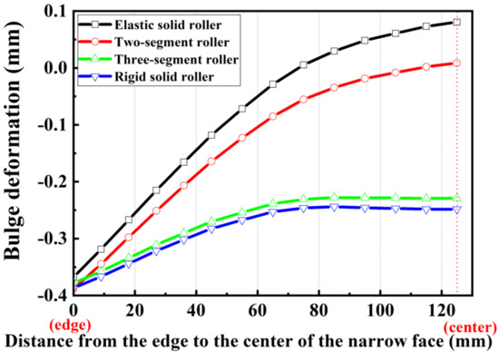 The horizontal bulge deformation of the slab’s narrow side was uneven, and the bulge deformation of the narrow side with the three-segment rollers was relatively close to that of the rigid rollers. The bulge deformation on the narrow side with the three-segment rollers reduced from 0.38 to 0.23 mm, a decrease of 39.5%. The bulge deformation on the narrow side with the two-segment rollers reduced from 0.39 to −0.008 mm, which was down by 102%. The bulge deformation on the narrow side with the rigid solid rollers reduced from 0.39 to 0.25 mm, dropping by 35.9%. The bulge deformation on the narrow side with the elastic solid rollers reduced from 0.37 to −0.08 mm, a decrease of 121.6%.