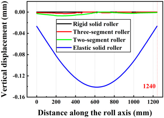 The stiffness of the casting roller was an important factor affecting slab bulge deformation. In the bulging models, the vertical displacement of the elastic casting roller had occurred, which was selected to measure the stiffness of the casting roller. The results are shown in Figure 9. The vertical displacement of the elastic solid roller was a reverse parabola distribution. The maximum value of 0.14 mm appeared in the center of the solid roller. The rigid roller was not deformed, so the vertical displacement was 0 mm. The vertical displacement of the two-segment roller was evenly distributed around 0.004 mm. The displacement of the three-segment roller in the vertical direction was generally distributed around 0.0015 mm. The average vertical displacement of the roller was selected for comparison to intuitively analyze the stiffness of the casting rollers. The average vertical displacement of the elastic solid roller was 0.07 mm, the average vertical displacement of the two-segment roller was 0.004 mm, and that of the three-segment roller was 0.0015 mm. The stiffness of the two-segment roller was 17.5 times greater than that of the solid roller, and the stiffness of the three-segment roller was 46.7 times greater than that of the solid roller. As the number of sections increased, the deflection of the segment roller during the continuous casting process was smaller. This indicated that the stiffness of the segmented roller was effectively improved. Combined with the previous analysis of casting slab deformation, the conclusion could be drawn that the stiffness of the segmented roller could be better improved than that of the solid casting roller, and the bulge deformation of the slab could also be excellently reduced.