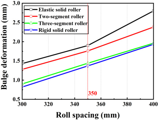 Roller spacing was adjusted by changing the gap between the rollers. Under the condition of constant casting speed (1.5 m∙min−1), the bulge deformation was calculated with 350 and 400 mm as the roller spacings. The average values of the bulge deformation were compared with that of a 300-mm roller spacing. The diameter of the roller was 230 mm. The results of slab bulge deformation on the wide side, shown in Figure 10 and Table 6, were established by the simulation model with different roller spacings. It could be concluded that the approximate distribution of the slab bulge deformation on the wide side would not change with a 50 mm increase of the roller spacing, and the improvement of the three-segment roller for bulge deformation was most obvious. However, the bulge deformation of the slab under the same continuous casting segmented roller increased greatly with the increase of the roller spacing. The maximum increment of bulging deformation was 67.1% under the rigid roller with the roller spacing changing from 300 to 350 mm. The maximum increment of bulge deformation under the elastic roller was 47.4%, with the roller spacing changing from 350 to 400 mm. The maximum increment of bulge deformation under the two-segment roller was 37.5%, with the roller spacing changing from 300 to 350 mm. The maximum increment of bulge deformation under the three-segment roller was 60.0%, with the roller spacing changing from 300 to 350 mm. The bulging increase was about the same for the rigid roller and the three-segment roller. This also proved that the effect of the three-segment roller was closest to that of the rigid roller on slab bulge deformation. The minimum increment was 32.9% under the elastic solid roller with the roller spacing changing from 300 to 350 mm.