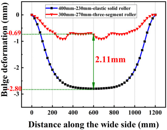 In general, the slab bulge deformation increased with the increased roller spacing and decreased with the increased roller diameter. The comparisons of average values of bulge deformation along the wide side are shown in Figure 11. When the roller spacing was 400 mm and the roller diameter was 230 mm, the maximum average value of bulge deformation along the wide side was 2.80 mm with the elastic solid rollers. When the roller spacing was 300 mm and the roller diameter was 270 mm, the minimum average value of bulge deformation along the wide side was 0.69 mm with the three-segment rollers; the difference was of 2.11 mm in comparison with the previous one. The bulge deformation was reduced by 75.4%. The optimized structural parameters could effectively control slab bulge deformation.