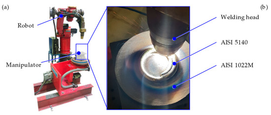 The powder is filtered with a sieving unit. Only powder consisting of metal grains with a diameter of minimum 50 µm to maximum 150 µm is used for welding. This corresponds to the current industrial standard for additional materials in powder form that are used for welding. The welding process is carried out on a 6-axis REIS RV-16 industrial robot (Reis Robotics GmbH, Obernburg am Main, Germany) with a tilt and turn table. The PTA torch that is used is the Kennametal Stellite HPM 302 (Deloro Wear Solutions, Koblenz, Germany), the current source is the Stellite Starweld PTA 302 (Deloro Wear Solutions, Koblenz, Germany). The welding equipment can be seen in Figure 2a.