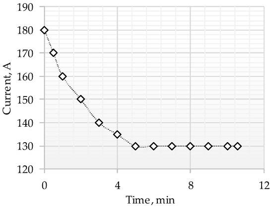 The discs are cut with a water-cooled band saw from a long round steel. After sawing, the surfaces of the discs are cleaned with acetone. There is no further surface treatment before welding. To coat the discs, AISI 5140 is welded in a spiral until the surface of the bearing track is fully coated. This process can be seen in Figure 2b. The entire welding process takes a total of 10 min and 35 s, which leads to a strong heating of the disc to up to 650 °C. With constant welding parameters, this strong heating leads to an ever-increasing material dilution between the cladding material and the substrate. Therefore, the current is slowly reduced from 180 A at the beginning of the welding process to only 130 A at the end of the process in order to keep the dilution as low and constant as possible. The exact course of the current intensity in the PTA welding process is shown in Figure 3.