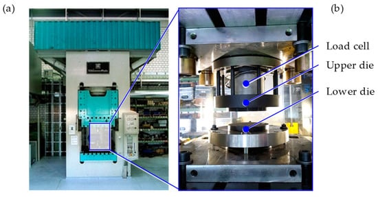 In order to improve the microstructure and mechanical properties of the welded material, the multi-material semi-finished workpieces were subsequently formed by die forging after the PTA welding. For the manufacturing of hybrid bearing washers, a single-stage forming process was developed. The die forging tests were performed on a hydraulic press with a maximum capacity of 12,000 kN with a tool system depicted in Figure 4. Before forging, the bearing washers were heated up to the forging temperature of 1050 °C in a chamber furnace. In order to determine the heating time, the initial heating tests with thermocouples integrated on the specimens were conducted. To prevent the oxidation of the welded layer at the heating stage, a gas flushing box was used, which was flooded with inert gas nitrogen during heating. After heating, the multi-material workpieces were manually transported to the forging tool and formed to the final geometry. The maximal pressing force of approx. 1700 kN was measured by an integrated load cell. The height of the bearing washers was finally reduced to approx. 10 mm. Following, the forged bearing washers were slowly cooled in the air.