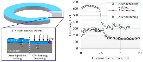 The cross-section of the hybrid bearing washer after forging is shown in Figure 6b. After hot forming, the semi-finished discs were slowly cooled in air. Therefore, the base material and the cladding layer are ferritic/perlitic. However, due to the twice as high carbon content, the cladding layer has considerably more perlite than the base material. The structure of the cladding material is fine-grained and homogeneous. In comparison to the pictures of the welded samples, these pictures show that a complete microstructure recrystallization has taken place in the cladding layer. Disadvantageous microstructure formations, which can have a negative effect compared to the later type of loading and which are caused by the heat influence of the welding process, are dissolved by the forming process. This effect can be explained by thermal, mechanical and thermomechanical treatment during the warm forming which leads to improved mechanical properties and component quality as shown in previous research works [20].
